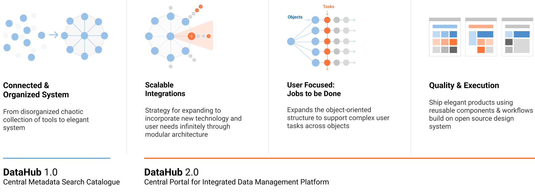 Most data apps in the data ecosystem deal with doing actions on data entities, like metrics, datasets, dashboards and more. With this central portal, all object pages have similar layouts and templates. The entity overview page features content from all related apps, and can link to sub-pages or out to the workflow/task apps.