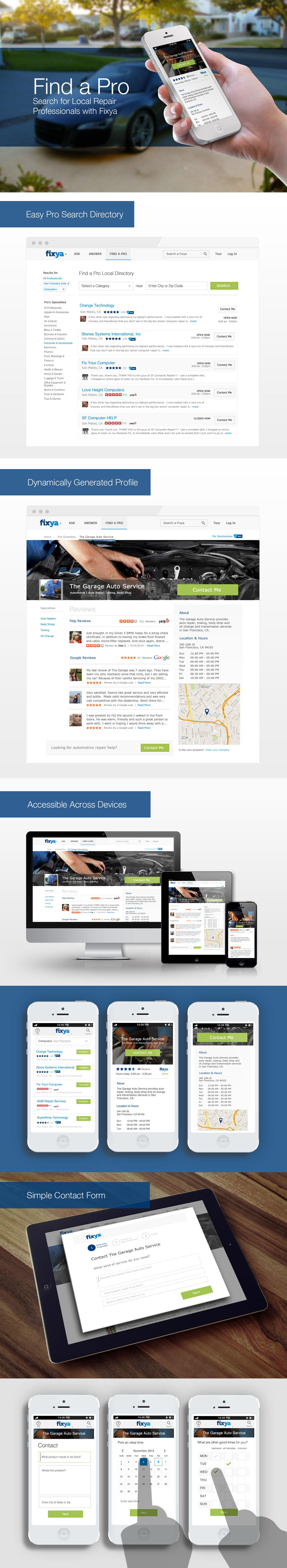 Easy UX for finding local repair pros. Search by location & specialty. Browse profiles and contact easily.